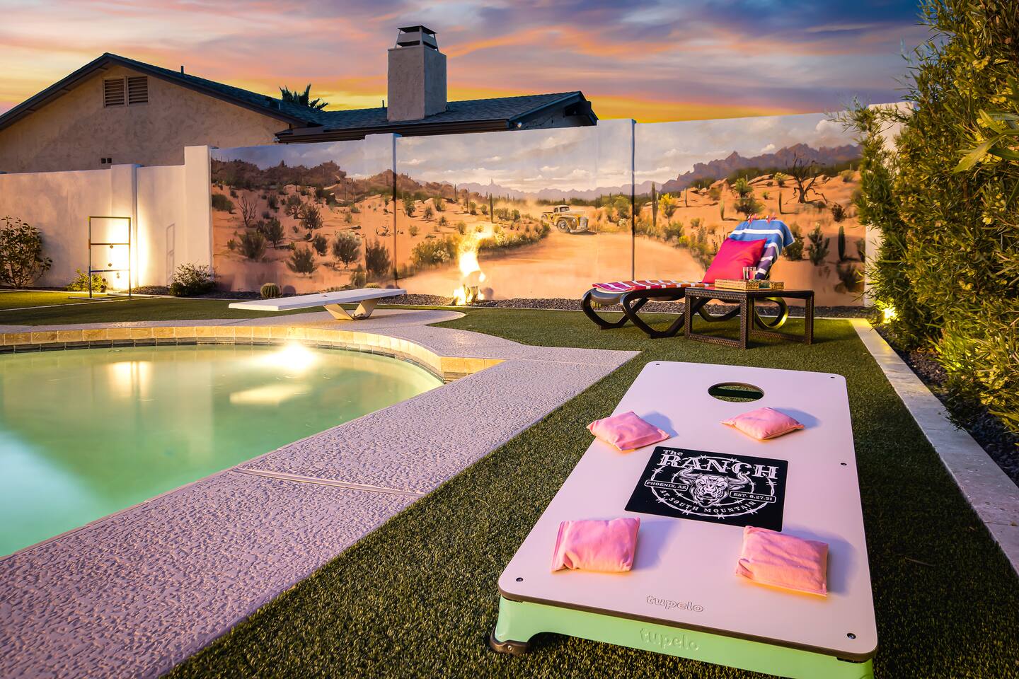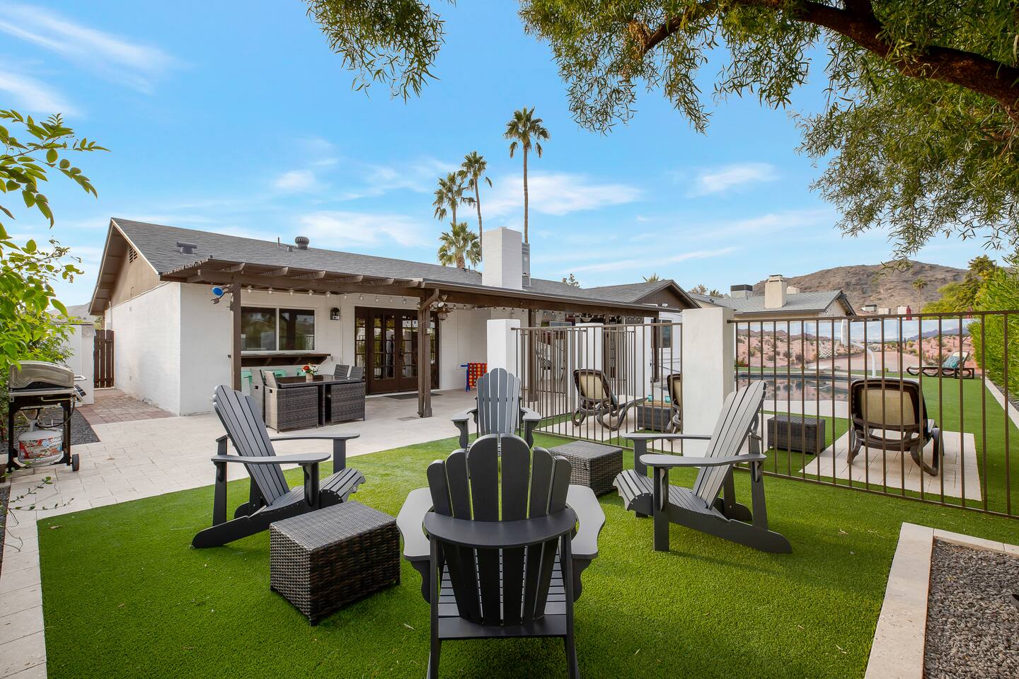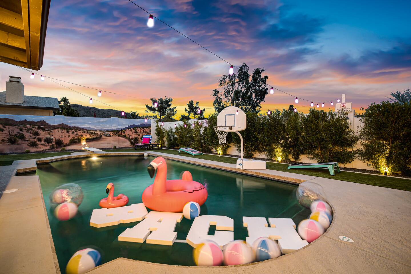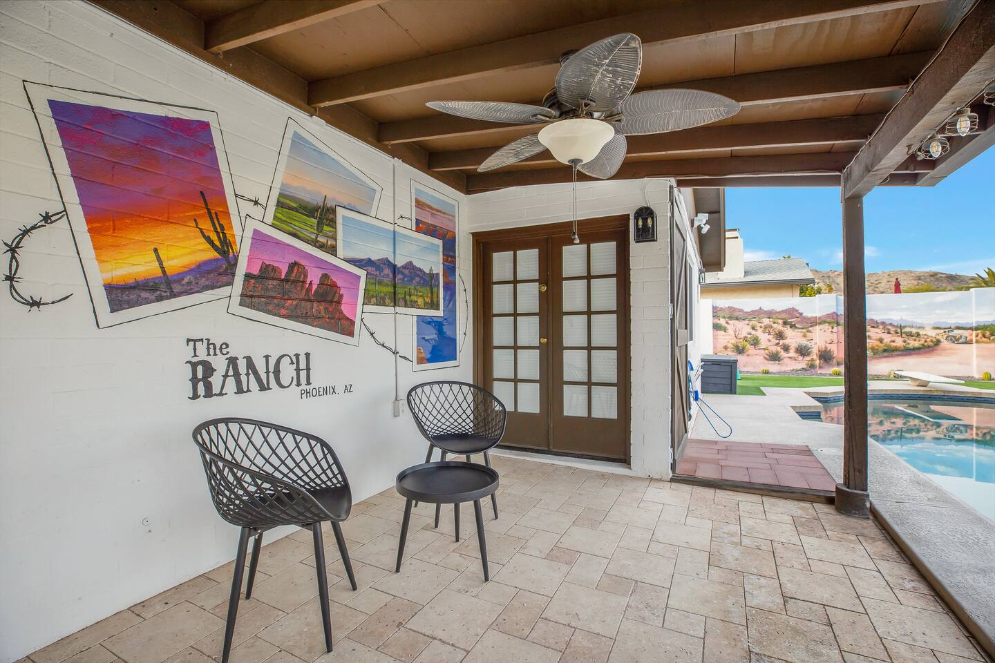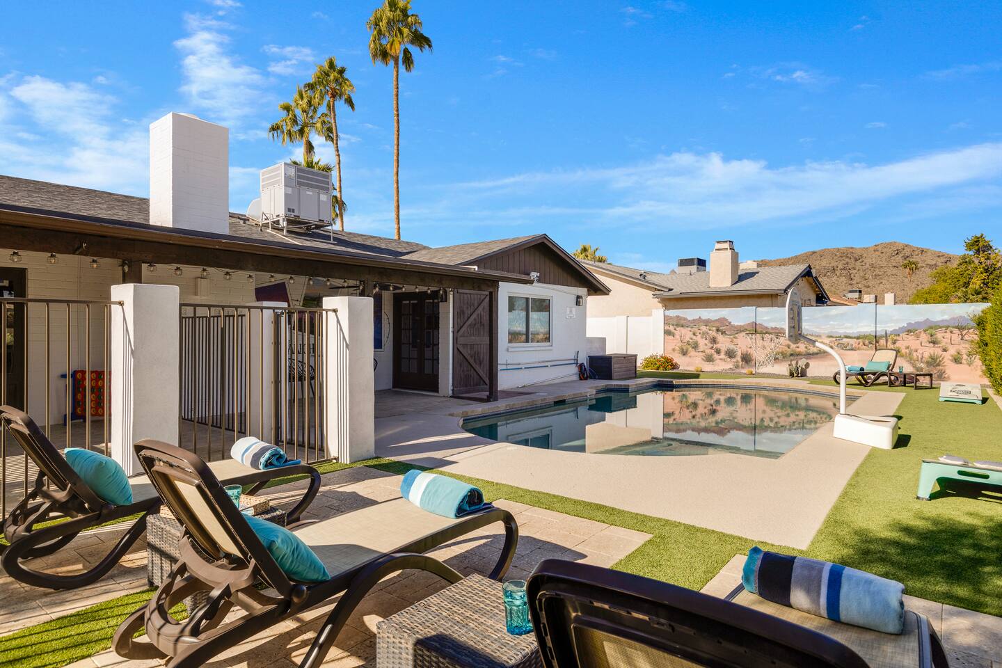 Arizona’s warm climate and scenic mountain views, allow for enjoyment of outdoor living year-round whether you are a Golfer, a sports enthusiast, avid hiker, or vacationer. With the ability to comfortably sleep up to 8 people, it is perfect for a group gathering, multi-family vacation, or single-family vacation. This rustic style home has both a romantic and relaxing atmosphere while also catering to families. Located conveniently off the I-10, Old Town Scottsdale is also only a 25-min drive away. The Backyard Oasis Grill and dine with friends and family under the large covered patio. Enjoy the fully stocked kitchen for all your meals. Take a dip in the sparkling pool, and soak in the sun at the poolside loungers while enjoying the scenic mountain views. The pool comes complete with a deep end and water basketball hoop in our beautifully landscaped yard. Pool season is year round at the Ranch with the pool heat set point to 85 degrees during fall, winter, and spring. Play a game of Cornhole on the grassy lawn or enjoy conversations while relaxing in the Adirondack chairs. Find shade under the large pergola while sharing drinks at the bar top. Let the outdoors be your indoors! ** Please note that the actual pool temperature can be lower than 85 degrees (low 80's/upper 70's) when we experience cooler weather (especially during winter months). This is an outdoor swimming pool and our heater is not designed to heat to hot tub temperatures. ** Please note that diving board pictured has been removed for liability purposes. Updated pictures coming soon** The Rooms The master suite has French doors that open to a poolside patio to share coffee or cocktails, and it offers a king bed and a private bathroom. There is a second oversized/large bedroom also fitted with a king bed. In the third bedroom, you will find a queen-sized bed while the fourth bedroom has two twin-sized beds. Up to two additional guests can sleep on the pull-out bed on the leather couch. Traveling with Children? We have thought of all the important details so you can travel lighter. We offer: a bedside bassinet for infants not yet sitting up, an infant and toddler bathtub, a pack-n-play for toddlers, a high chair, dishware for children, an infant carrier for hiking, and an umbrella stroller. The pool is also safely secured via proper gate.