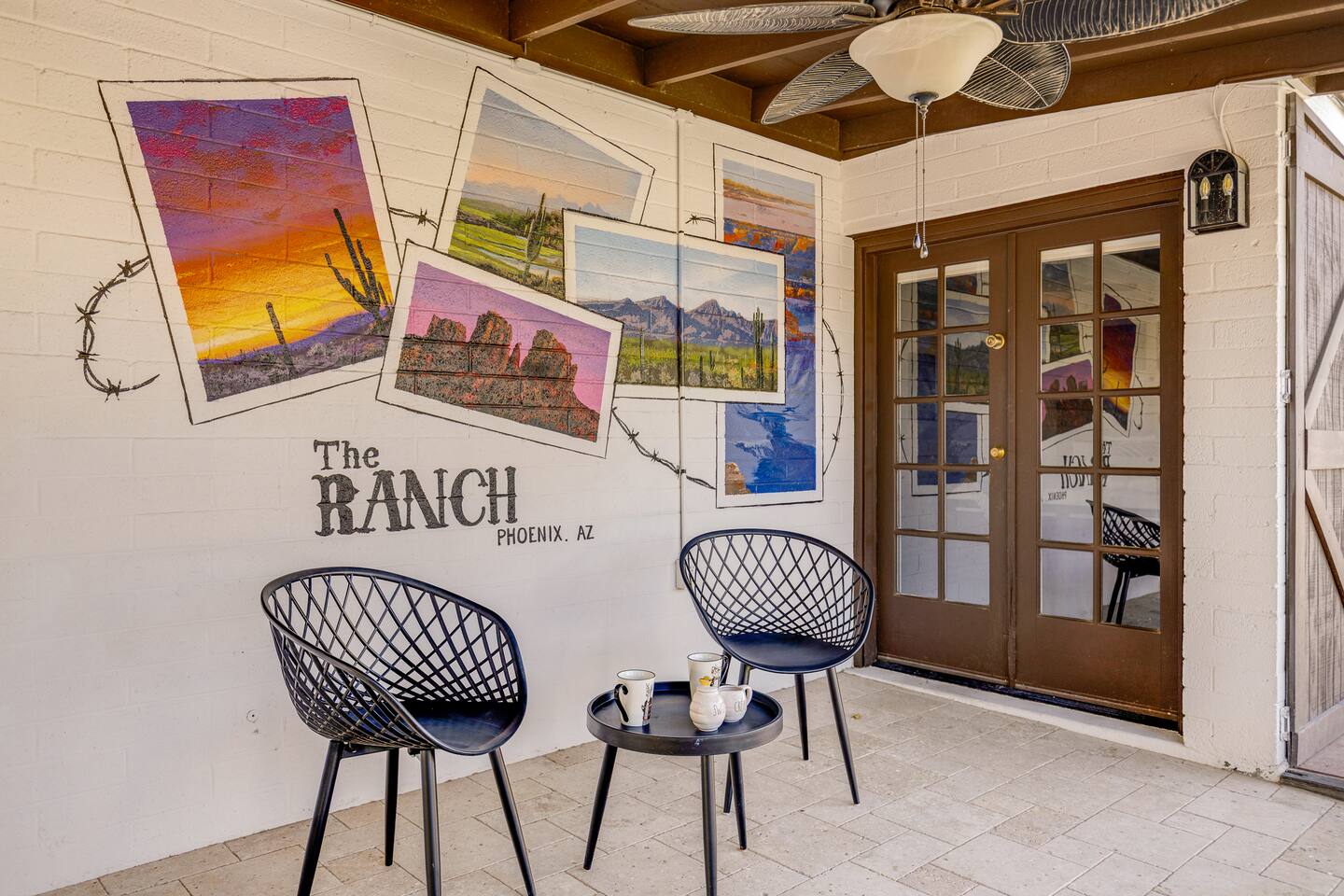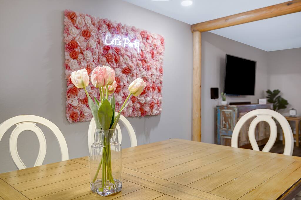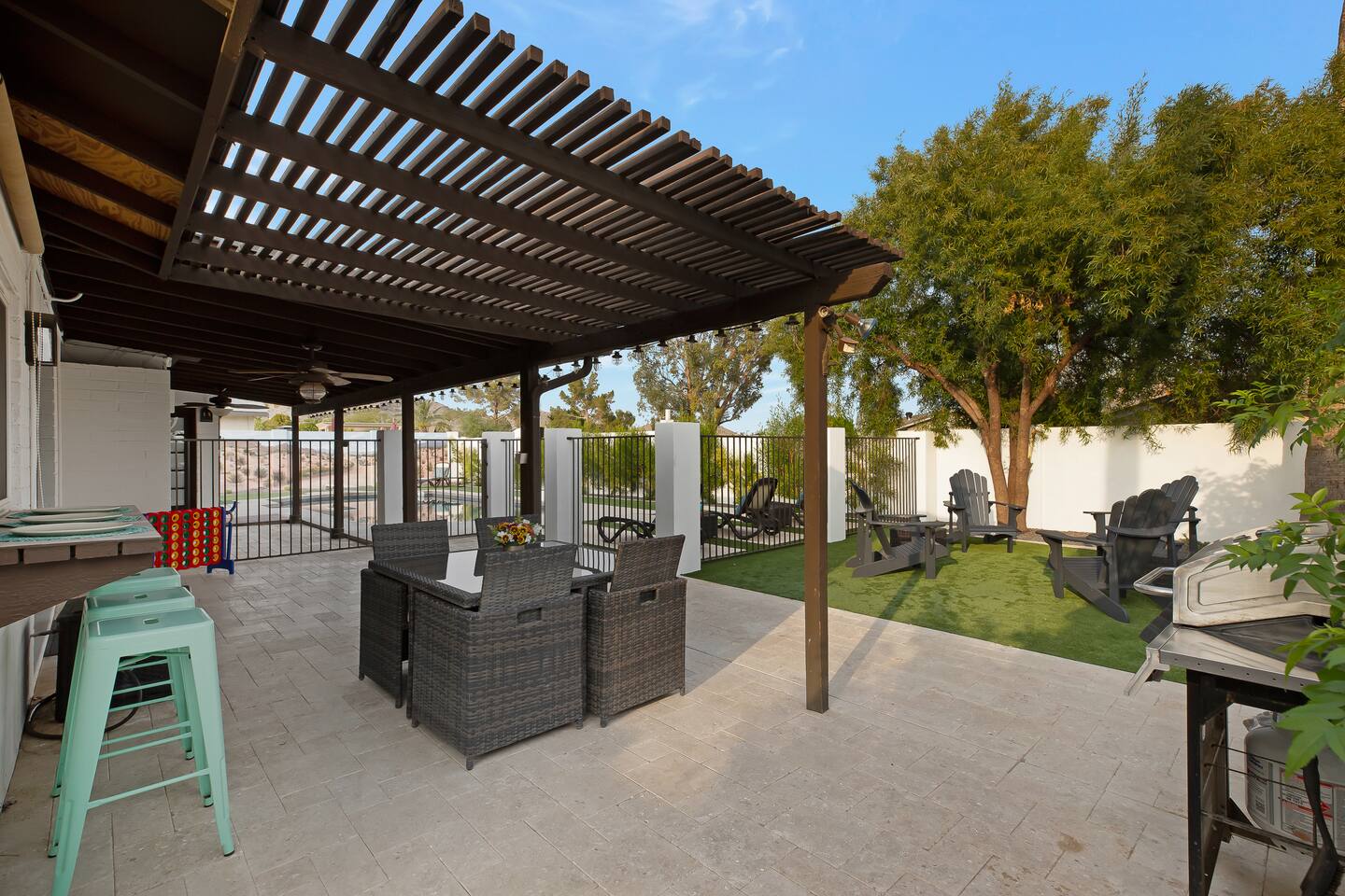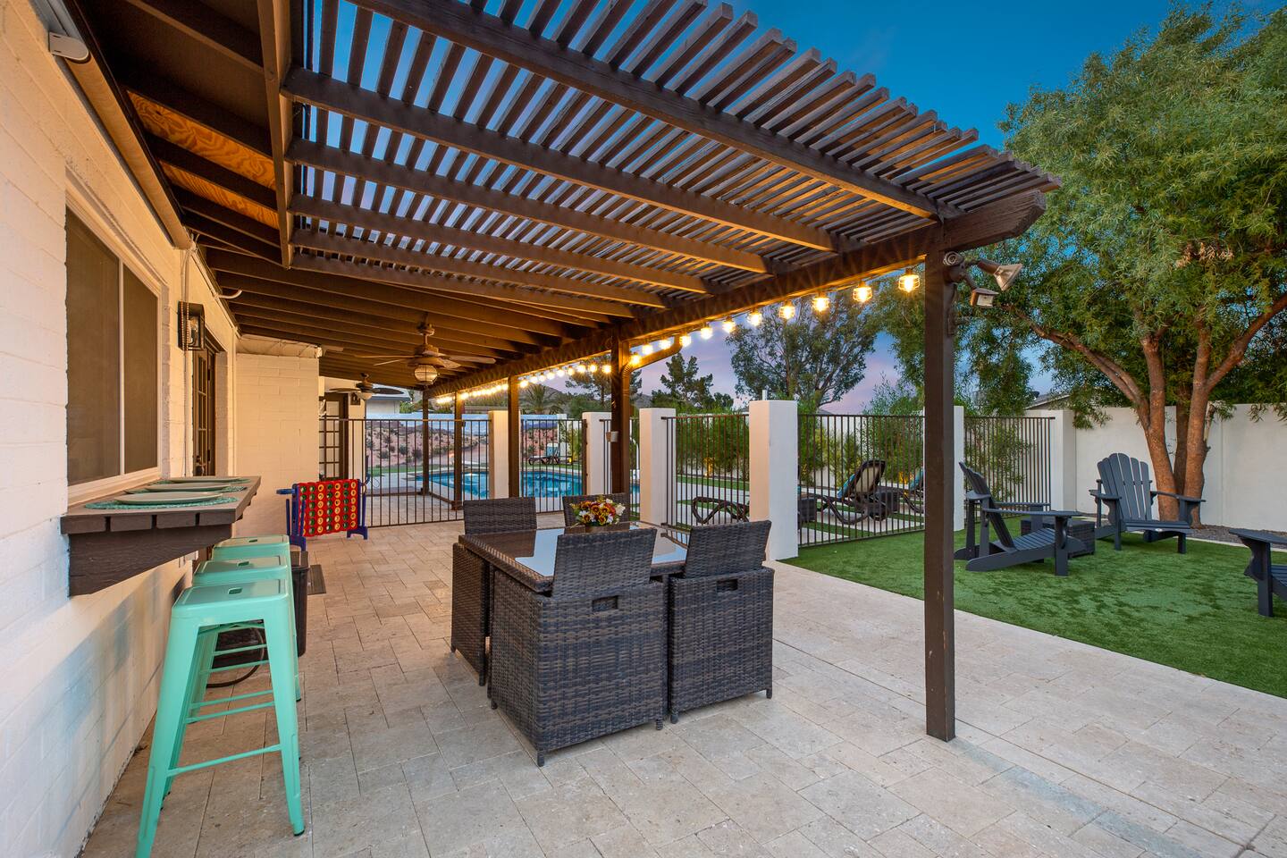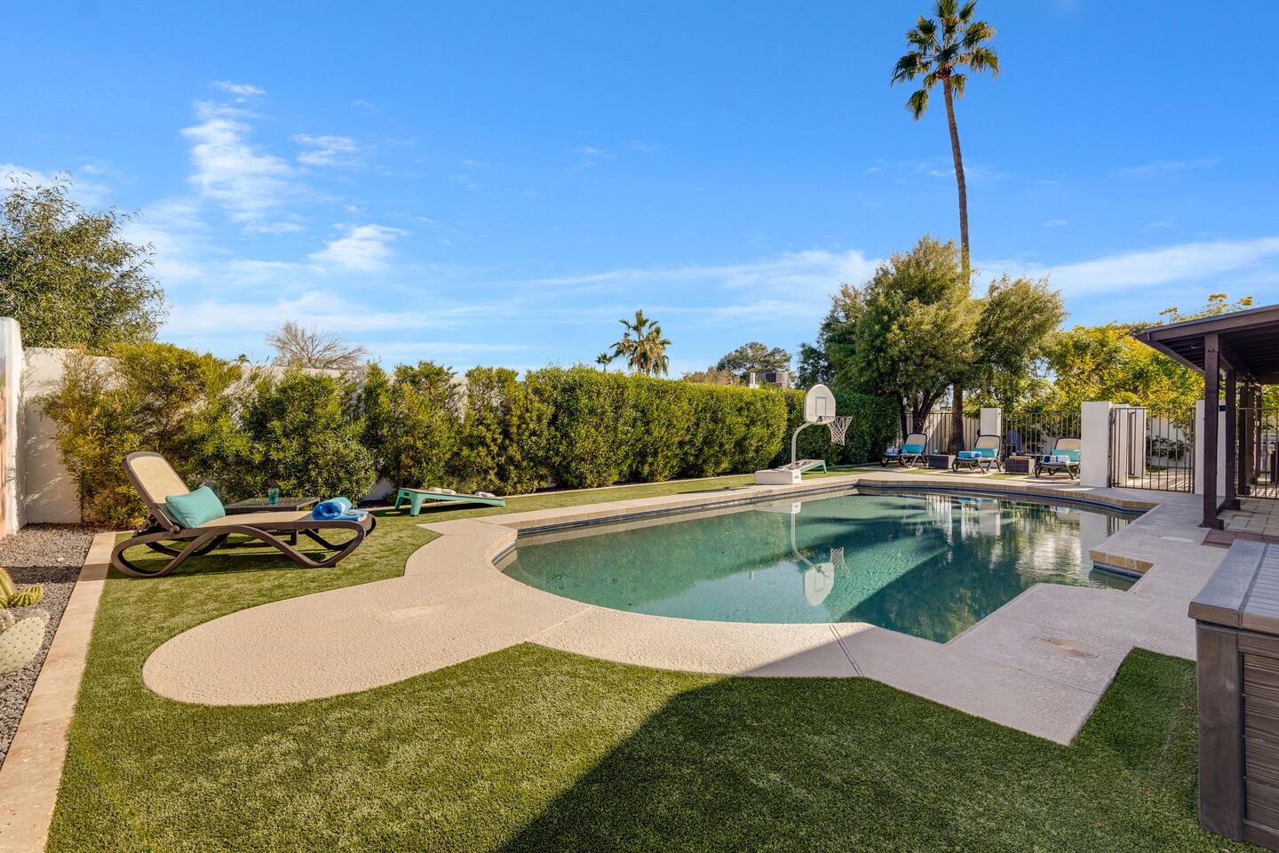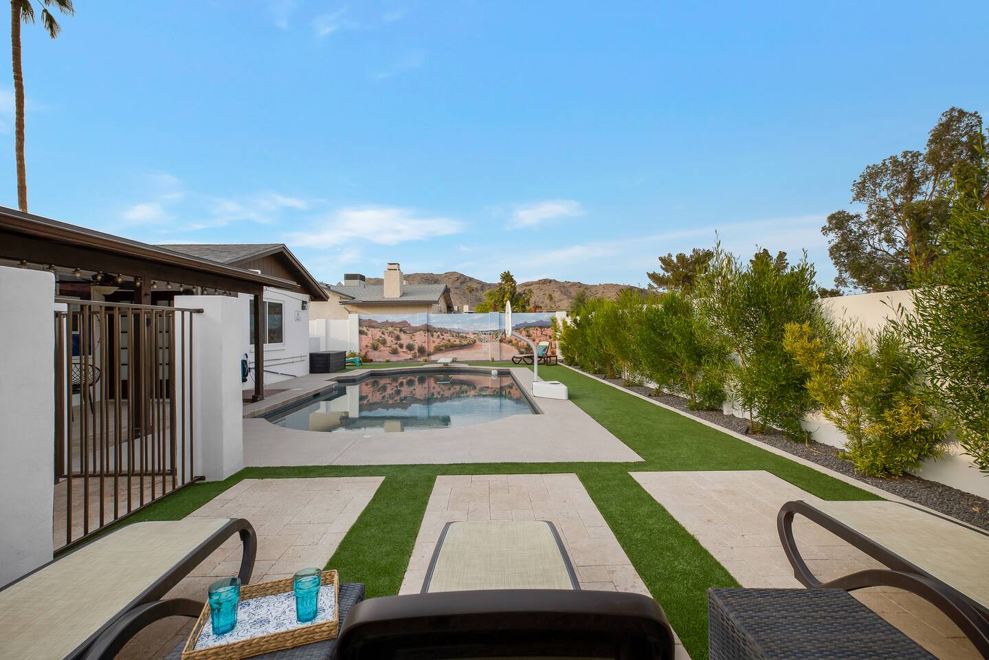 Arizona’s warm climate and scenic mountain views, allow for enjoyment of outdoor living year-round whether you are a Golfer, a sports enthusiast, avid hiker, or vacationer. With the ability to comfortably sleep up to 8 people, it is perfect for a group gathering, multi-family vacation, or single-family vacation. This rustic style home has both a romantic and relaxing atmosphere while also catering to families. Located conveniently off the I-10, Old Town Scottsdale is also only a 25-min drive away. The Backyard Oasis Grill and dine with friends and family under the large covered patio. Enjoy the fully stocked kitchen for all your meals. Take a dip in the sparkling pool, and soak in the sun at the poolside loungers while enjoying the scenic mountain views. The pool comes complete with a deep end and water basketball hoop in our beautifully landscaped yard. Pool season is year round at the Ranch with the pool heat set point to 85 degrees during fall, winter, and spring. Play a game of Cornhole on the grassy lawn or enjoy conversations while relaxing in the Adirondack chairs. Find shade under the large pergola while sharing drinks at the bar top. Let the outdoors be your indoors! ** Please note that the actual pool temperature can be lower than 85 degrees (low 80's/upper 70's) when we experience cooler weather (especially during winter months). This is an outdoor swimming pool and our heater is not designed to heat to hot tub temperatures. ** Please note that diving board pictured has been removed for liability purposes. Updated pictures coming soon** The Rooms The master suite has French doors that open to a poolside patio to share coffee or cocktails, and it offers a king bed and a private bathroom. There is a second oversized/large bedroom also fitted with a king bed. In the third bedroom, you will find a queen-sized bed while the fourth bedroom has two twin-sized beds. Up to two additional guests can sleep on the pull-out bed on the leather couch. Traveling with Children? We have thought of all the important details so you can travel lighter. We offer: a bedside bassinet for infants not yet sitting up, an infant and toddler bathtub, a pack-n-play for toddlers, a high chair, dishware for children, an infant carrier for hiking, and an umbrella stroller. The pool is also safely secured via proper gate.