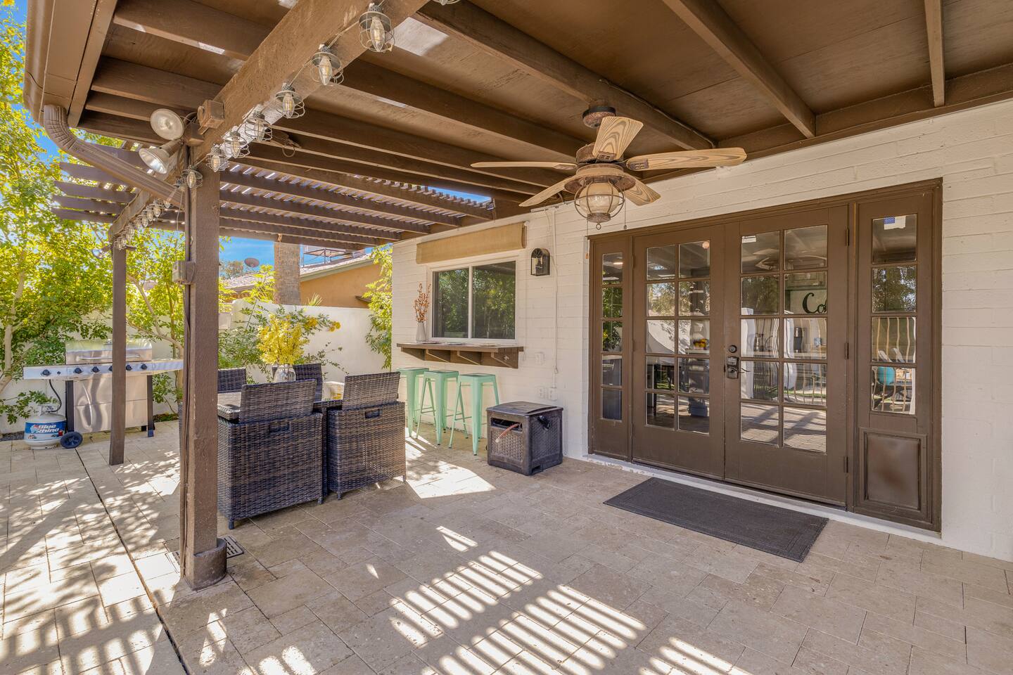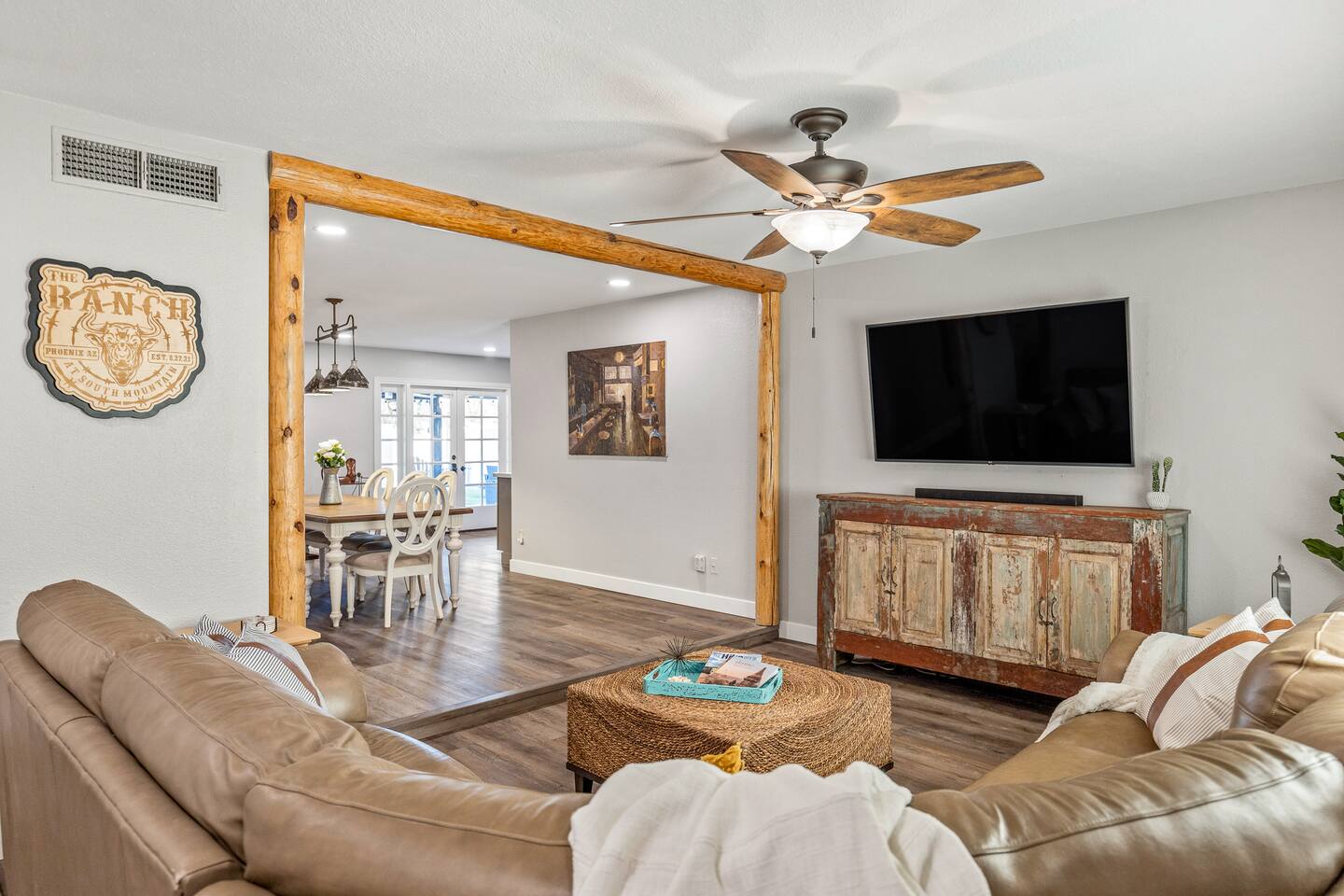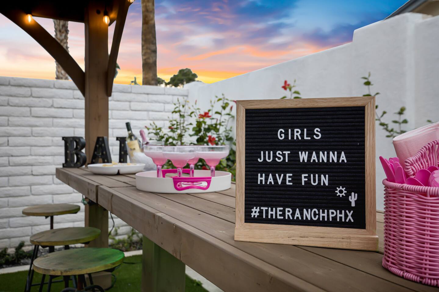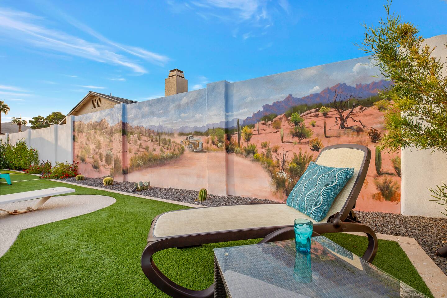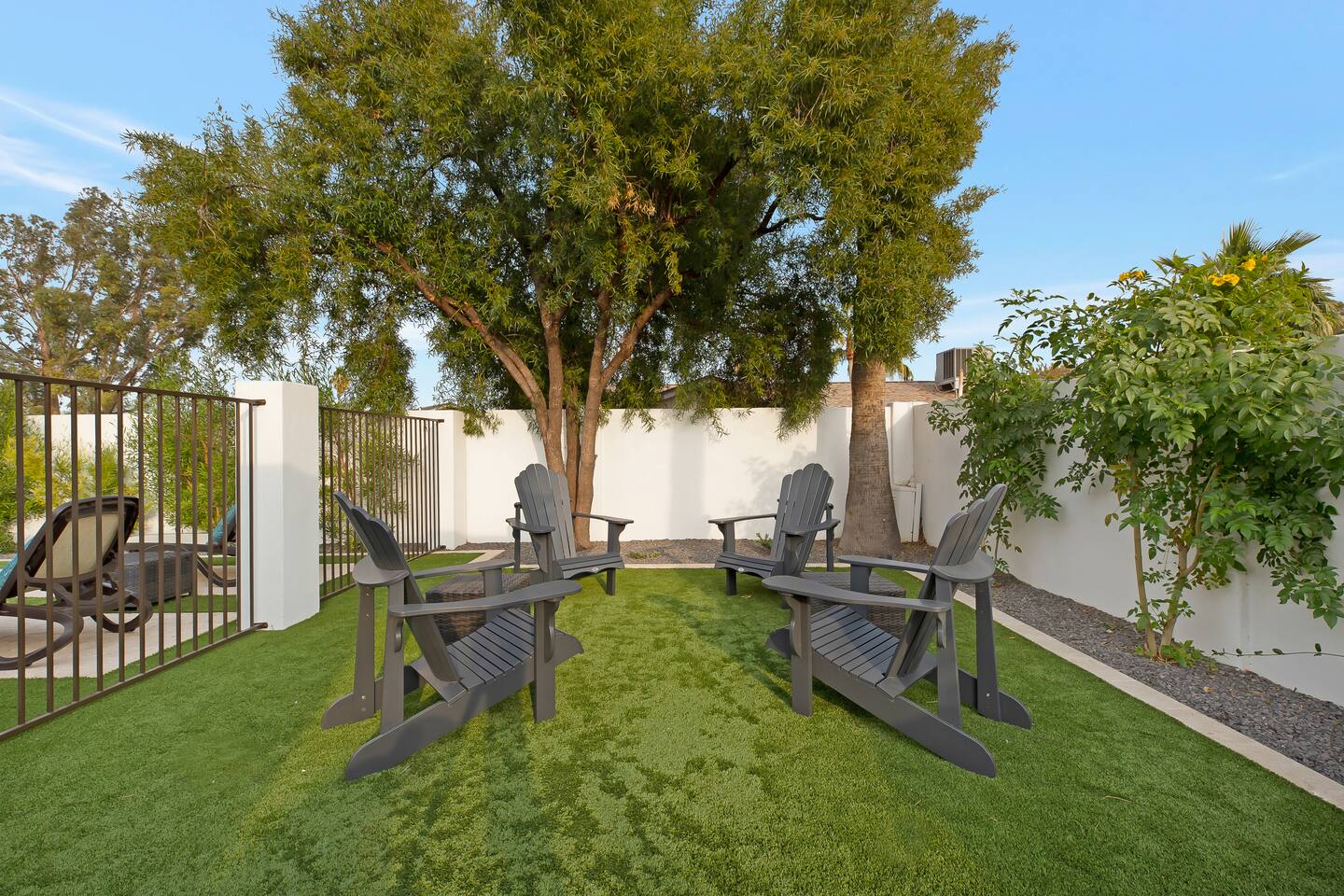 Arizona’s warm climate and scenic mountain views, allow for enjoyment of outdoor living year-round whether you are a Golfer, a sports enthusiast, avid hiker, or vacationer. With the ability to comfortably sleep up to 8 people, it is perfect for a group gathering, multi-family vacation, or single-family vacation. This rustic style home has both a romantic and relaxing atmosphere while also catering to families. Located conveniently off the I-10, Old Town Scottsdale is also only a 25-min drive away. The Backyard Oasis Grill and dine with friends and family under the large covered patio. Enjoy the fully stocked kitchen for all your meals. Take a dip in the sparkling pool, and soak in the sun at the poolside loungers while enjoying the scenic mountain views. The pool comes complete with a deep end and water basketball hoop in our beautifully landscaped yard. Pool season is year round at the Ranch with the pool heat set point to 85 degrees during fall, winter, and spring. Play a game of Cornhole on the grassy lawn or enjoy conversations while relaxing in the Adirondack chairs. Find shade under the large pergola while sharing drinks at the bar top. Let the outdoors be your indoors! ** Please note that the actual pool temperature can be lower than 85 degrees (low 80's/upper 70's) when we experience cooler weather (especially during winter months). This is an outdoor swimming pool and our heater is not designed to heat to hot tub temperatures. ** Please note that diving board pictured has been removed for liability purposes. Updated pictures coming soon** The Rooms The master suite has French doors that open to a poolside patio to share coffee or cocktails, and it offers a king bed and a private bathroom. There is a second oversized/large bedroom also fitted with a king bed. In the third bedroom, you will find a queen-sized bed while the fourth bedroom has two twin-sized beds. Up to two additional guests can sleep on the pull-out bed on the leather couch. Traveling with Children? We have thought of all the important details so you can travel lighter. We offer: a bedside bassinet for infants not yet sitting up, an infant and toddler bathtub, a pack-n-play for toddlers, a high chair, dishware for children, an infant carrier for hiking, and an umbrella stroller. The pool is also safely secured via proper gate.
