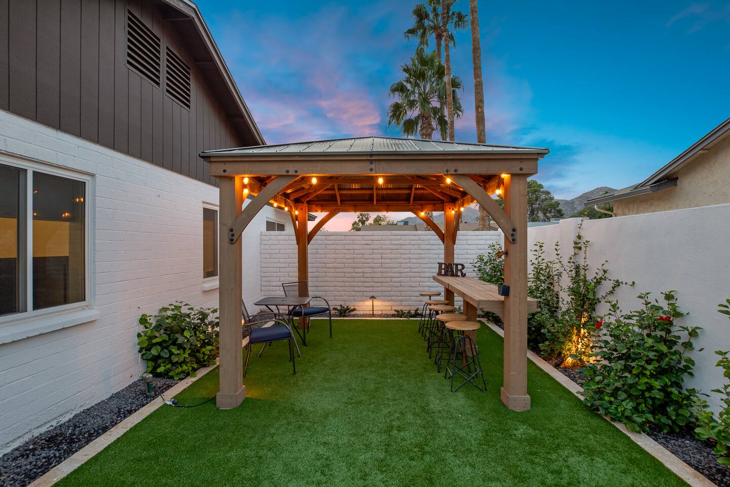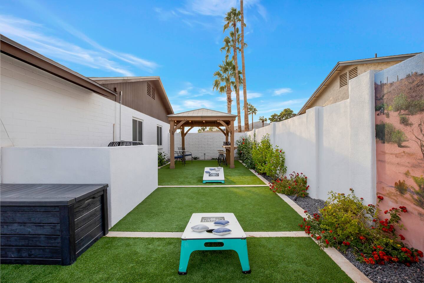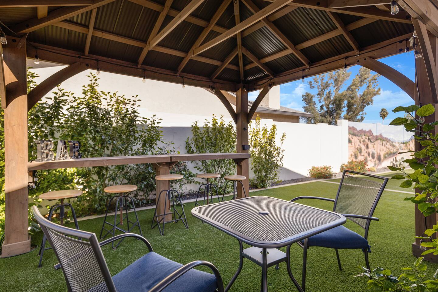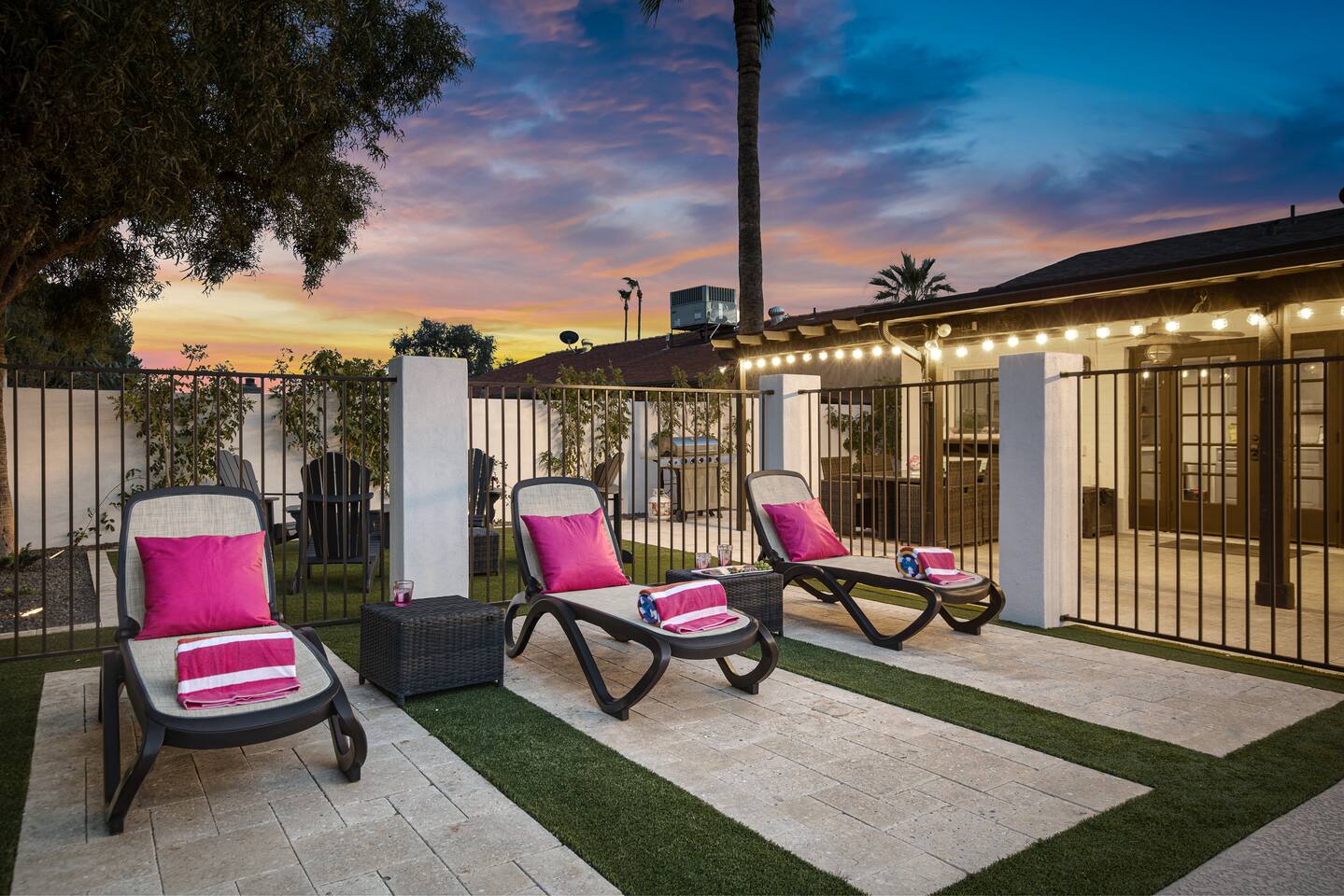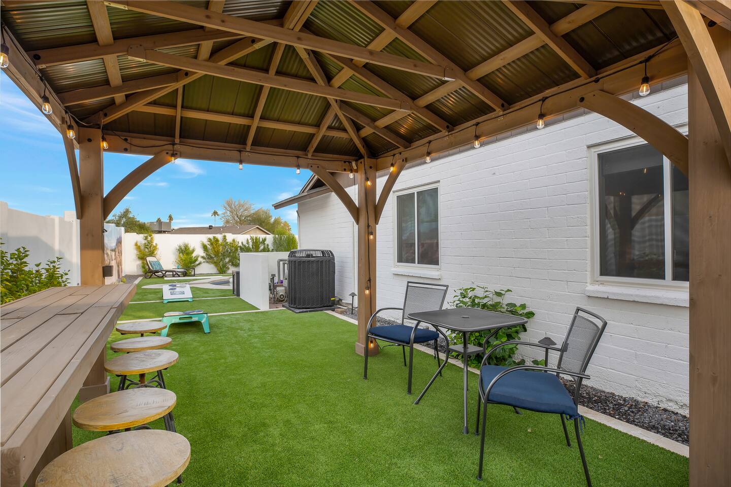 Arizona’s warm climate and scenic mountain views, allow for enjoyment of outdoor living year-round whether you are a Golfer, a sports enthusiast, avid hiker, or vacationer. With the ability to comfortably sleep up to 8 people, it is perfect for a group gathering, multi-family vacation, or single-family vacation. This rustic style home has both a romantic and relaxing atmosphere while also catering to families. Located conveniently off the I-10, Old Town Scottsdale is also only a 25-min drive away. The Backyard Oasis Grill and dine with friends and family under the large covered patio. Enjoy the fully stocked kitchen for all your meals. Take a dip in the sparkling pool, and soak in the sun at the poolside loungers while enjoying the scenic mountain views. The pool comes complete with a deep end and water basketball hoop in our beautifully landscaped yard. Pool season is year round at the Ranch with the pool heat set point to 85 degrees during fall, winter, and spring. Play a game of Cornhole on the grassy lawn or enjoy conversations while relaxing in the Adirondack chairs. Find shade under the large pergola while sharing drinks at the bar top. Let the outdoors be your indoors! ** Please note that the actual pool temperature can be lower than 85 degrees (low 80's/upper 70's) when we experience cooler weather (especially during winter months). This is an outdoor swimming pool and our heater is not designed to heat to hot tub temperatures. ** Please note that diving board pictured has been removed for liability purposes. Updated pictures coming soon** The Rooms The master suite has French doors that open to a poolside patio to share coffee or cocktails, and it offers a king bed and a private bathroom. There is a second oversized/large bedroom also fitted with a king bed. In the third bedroom, you will find a queen-sized bed while the fourth bedroom has two twin-sized beds. Up to two additional guests can sleep on the pull-out bed on the leather couch. Traveling with Children? We have thought of all the important details so you can travel lighter. We offer: a bedside bassinet for infants not yet sitting up, an infant and toddler bathtub, a pack-n-play for toddlers, a high chair, dishware for children, an infant carrier for hiking, and an umbrella stroller. The pool is also safely secured via proper gate.