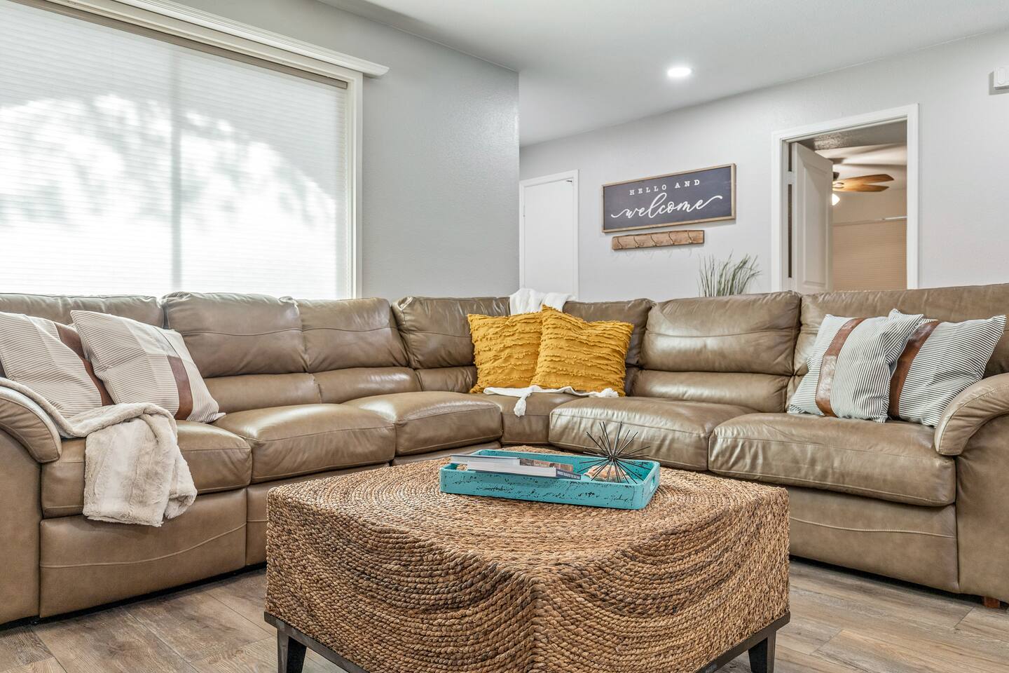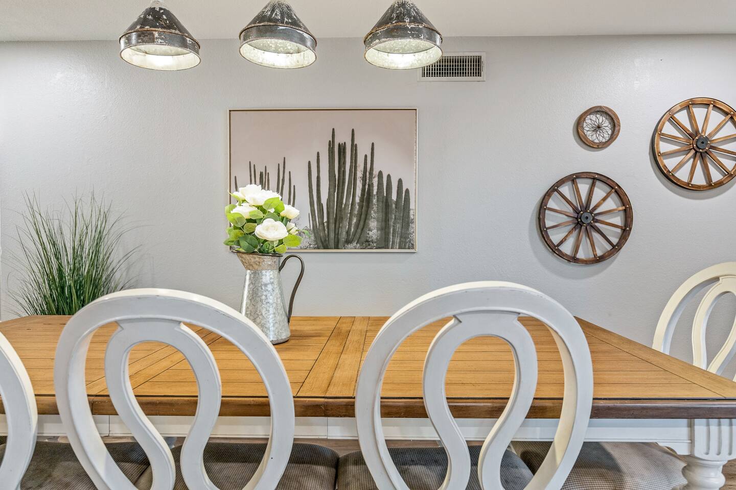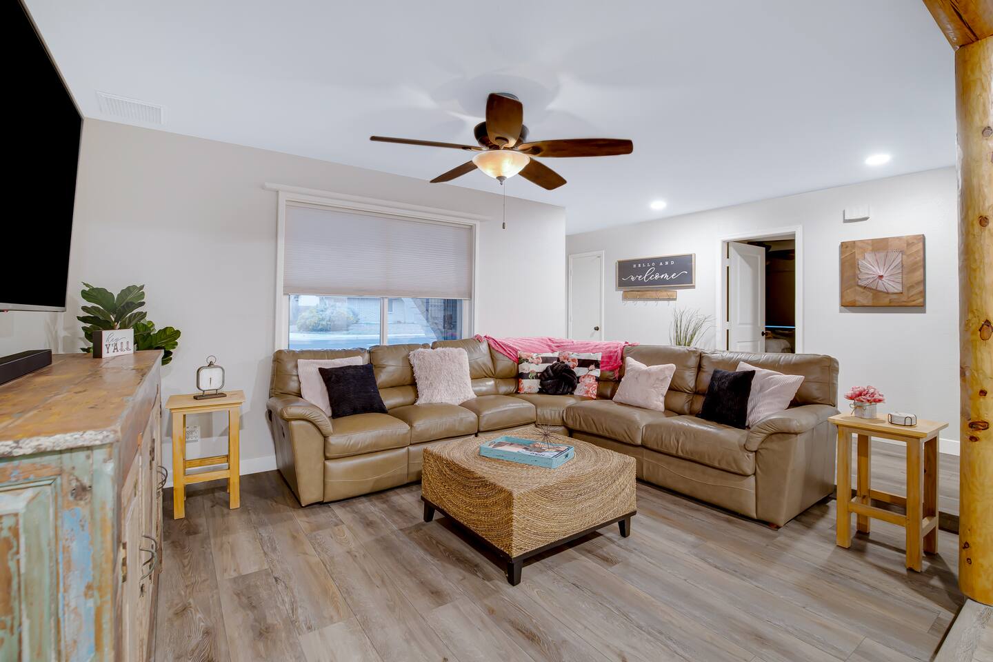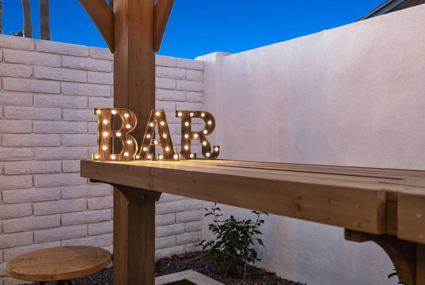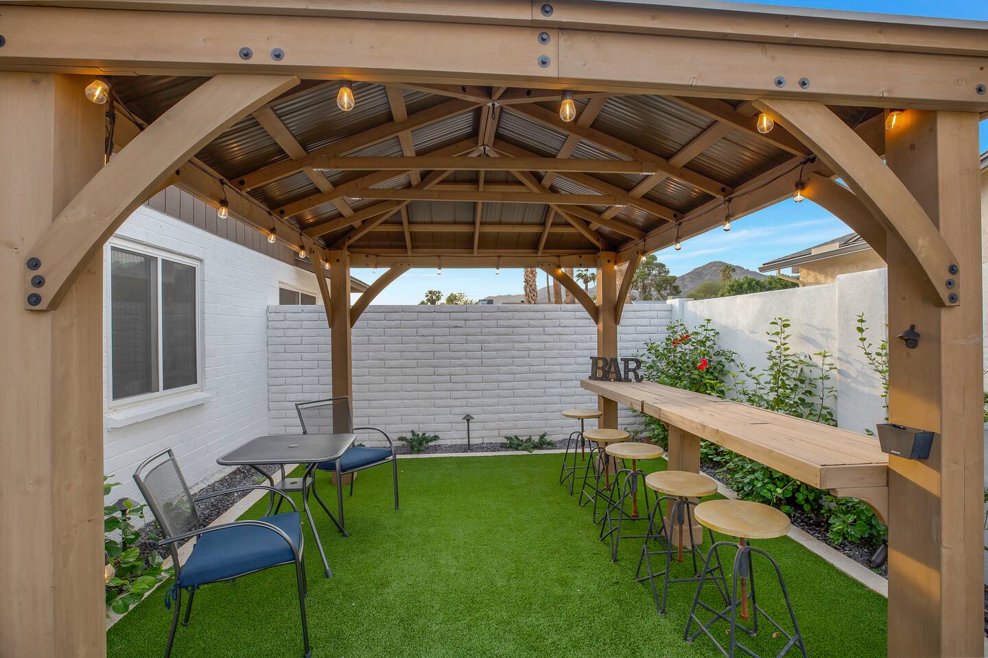 Arizona’s warm climate and scenic mountain views, allow for enjoyment of outdoor living year-round whether you are a Golfer, a sports enthusiast, avid hiker, or vacationer. With the ability to comfortably sleep up to 8 people, it is perfect for a group gathering, multi-family vacation, or single-family vacation. This rustic style home has both a romantic and relaxing atmosphere while also catering to families. Located conveniently off the I-10, Old Town Scottsdale is also only a 25-min drive away. The Backyard Oasis Grill and dine with friends and family under the large covered patio. Enjoy the fully stocked kitchen for all your meals. Take a dip in the sparkling pool, and soak in the sun at the poolside loungers while enjoying the scenic mountain views. The pool comes complete with a deep end and water basketball hoop in our beautifully landscaped yard. Pool season is year round at the Ranch with the pool heat set point to 85 degrees during fall, winter, and spring. Play a game of Cornhole on the grassy lawn or enjoy conversations while relaxing in the Adirondack chairs. Find shade under the large pergola while sharing drinks at the bar top. Let the outdoors be your indoors! ** Please note that the actual pool temperature can be lower than 85 degrees (low 80's/upper 70's) when we experience cooler weather (especially during winter months). This is an outdoor swimming pool and our heater is not designed to heat to hot tub temperatures. ** Please note that diving board pictured has been removed for liability purposes. Updated pictures coming soon** The Rooms The master suite has French doors that open to a poolside patio to share coffee or cocktails, and it offers a king bed and a private bathroom. There is a second oversized/large bedroom also fitted with a king bed. In the third bedroom, you will find a queen-sized bed while the fourth bedroom has two twin-sized beds. Up to two additional guests can sleep on the pull-out bed on the leather couch. Traveling with Children? We have thought of all the important details so you can travel lighter. We offer: a bedside bassinet for infants not yet sitting up, an infant and toddler bathtub, a pack-n-play for toddlers, a high chair, dishware for children, an infant carrier for hiking, and an umbrella stroller. The pool is also safely secured via proper gate.