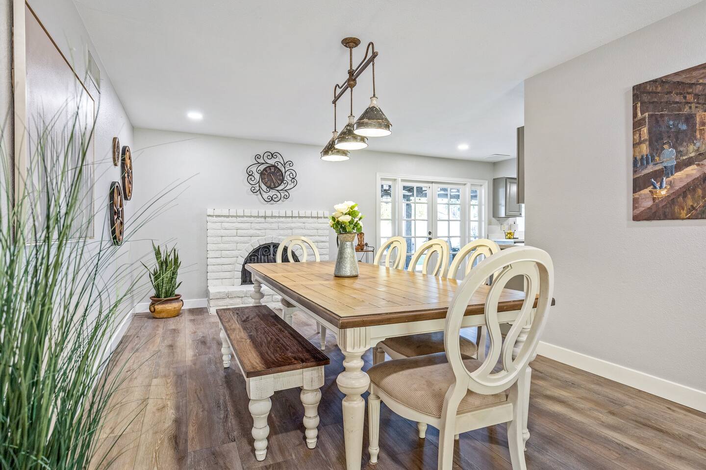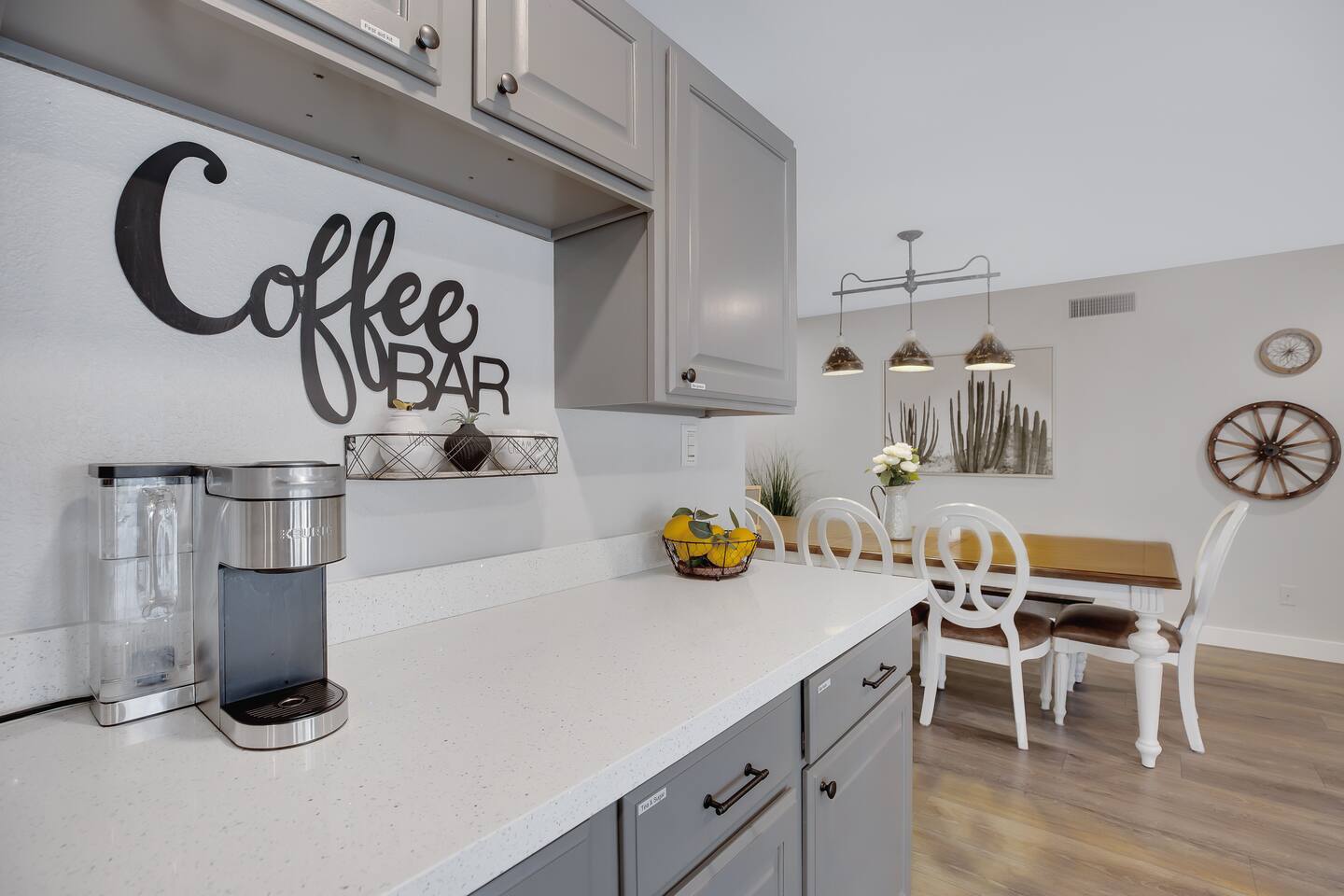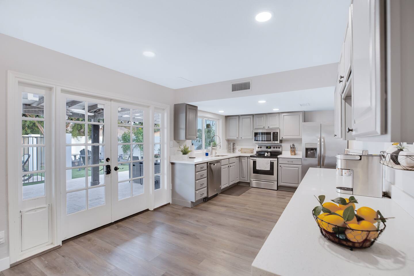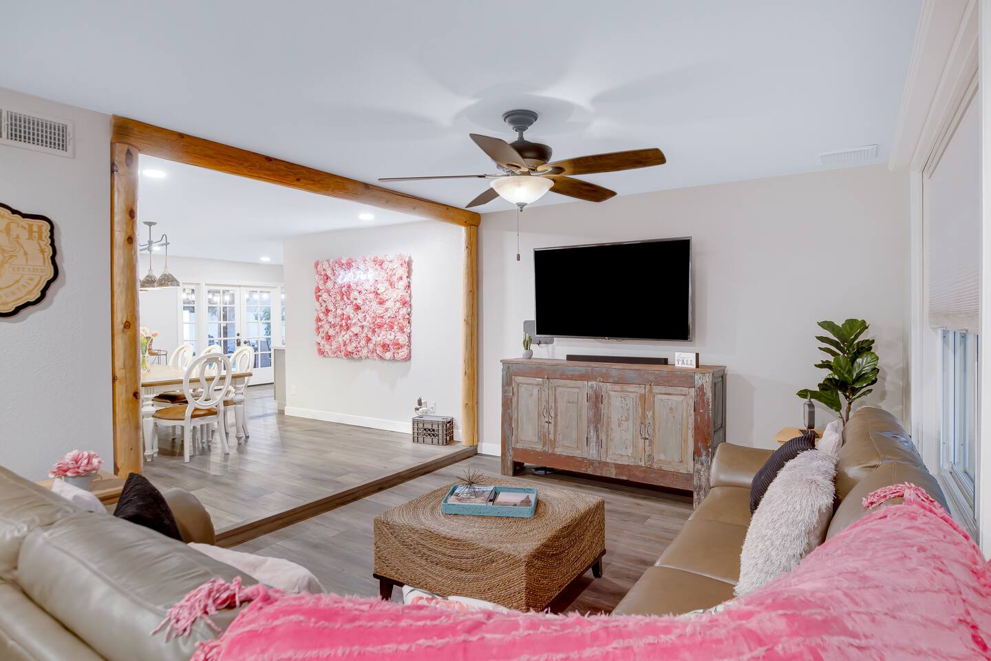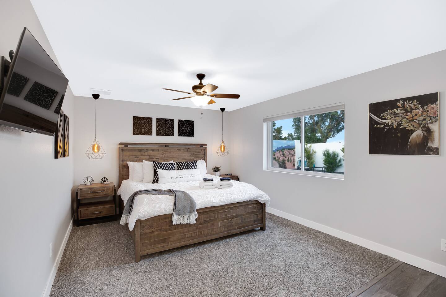 Arizona’s warm climate and scenic mountain views, allow for enjoyment of outdoor living year-round whether you are a Golfer, a sports enthusiast, avid hiker, or vacationer. With the ability to comfortably sleep up to 8 people, it is perfect for a group gathering, multi-family vacation, or single-family vacation. This rustic style home has both a romantic and relaxing atmosphere while also catering to families. Located conveniently off the I-10, Old Town Scottsdale is also only a 25-min drive away. The Backyard Oasis Grill and dine with friends and family under the large covered patio. Enjoy the fully stocked kitchen for all your meals. Take a dip in the sparkling pool, and soak in the sun at the poolside loungers while enjoying the scenic mountain views. The pool comes complete with a deep end and water basketball hoop in our beautifully landscaped yard. Pool season is year round at the Ranch with the pool heat set point to 85 degrees during fall, winter, and spring. Play a game of Cornhole on the grassy lawn or enjoy conversations while relaxing in the Adirondack chairs. Find shade under the large pergola while sharing drinks at the bar top. Let the outdoors be your indoors! ** Please note that the actual pool temperature can be lower than 85 degrees (low 80's/upper 70's) when we experience cooler weather (especially during winter months). This is an outdoor swimming pool and our heater is not designed to heat to hot tub temperatures. ** Please note that diving board pictured has been removed for liability purposes. Updated pictures coming soon** The Rooms The master suite has French doors that open to a poolside patio to share coffee or cocktails, and it offers a king bed and a private bathroom. There is a second oversized/large bedroom also fitted with a king bed. In the third bedroom, you will find a queen-sized bed while the fourth bedroom has two twin-sized beds. Up to two additional guests can sleep on the pull-out bed on the leather couch. Traveling with Children? We have thought of all the important details so you can travel lighter. We offer: a bedside bassinet for infants not yet sitting up, an infant and toddler bathtub, a pack-n-play for toddlers, a high chair, dishware for children, an infant carrier for hiking, and an umbrella stroller. The pool is also safely secured via proper gate.