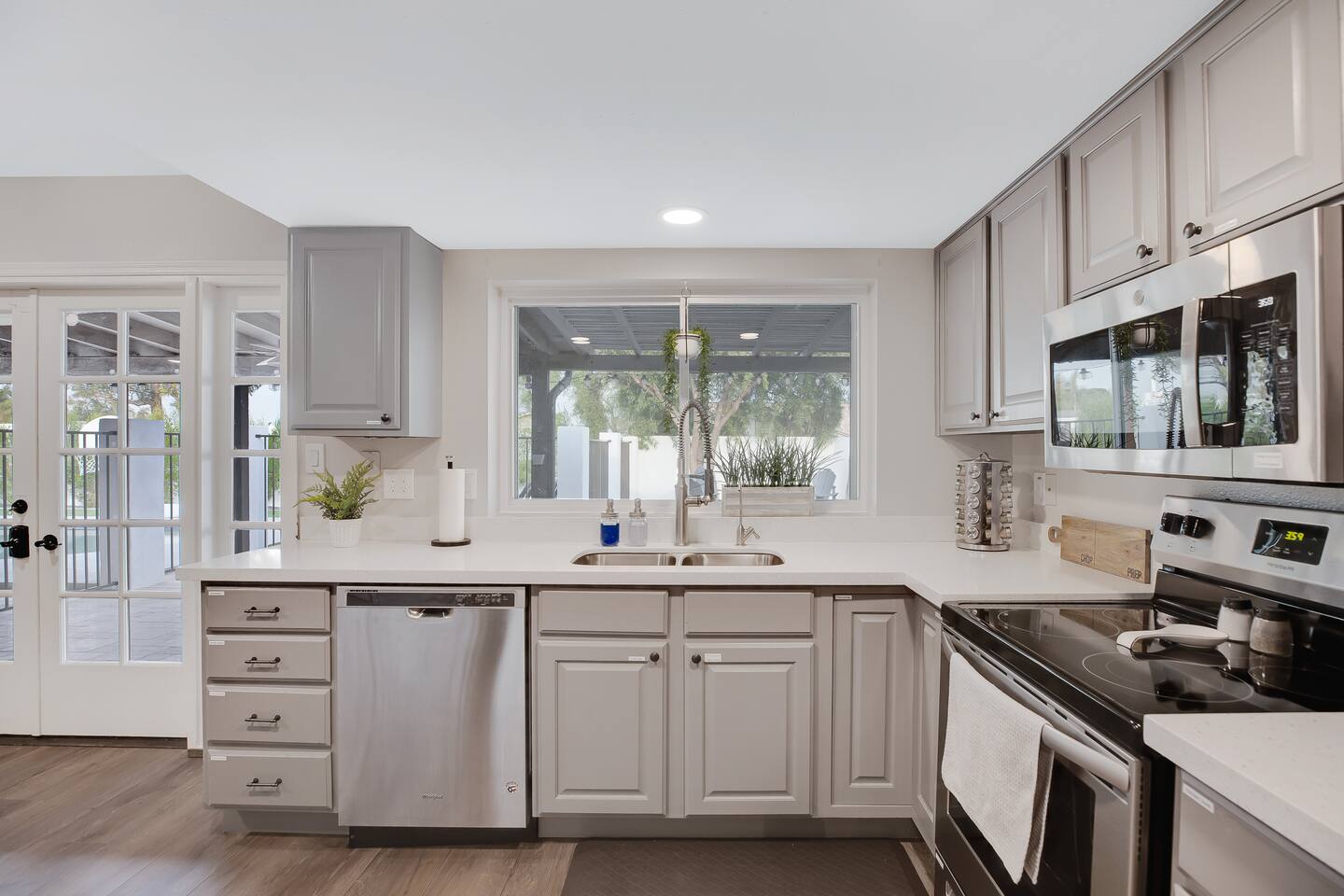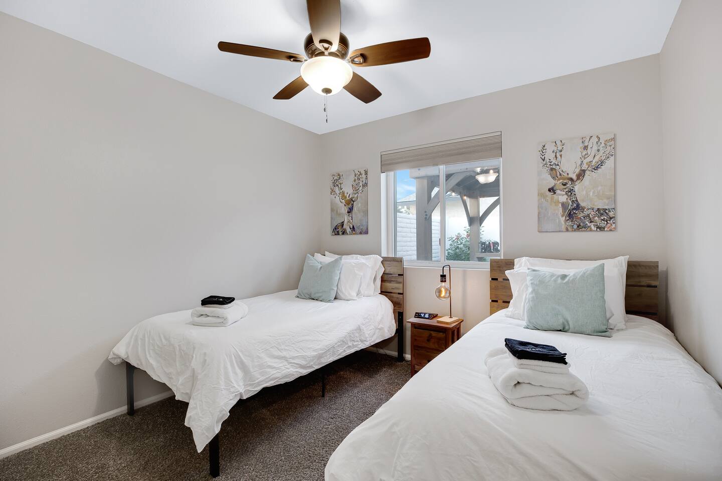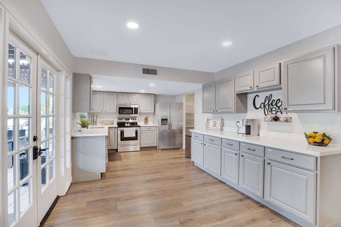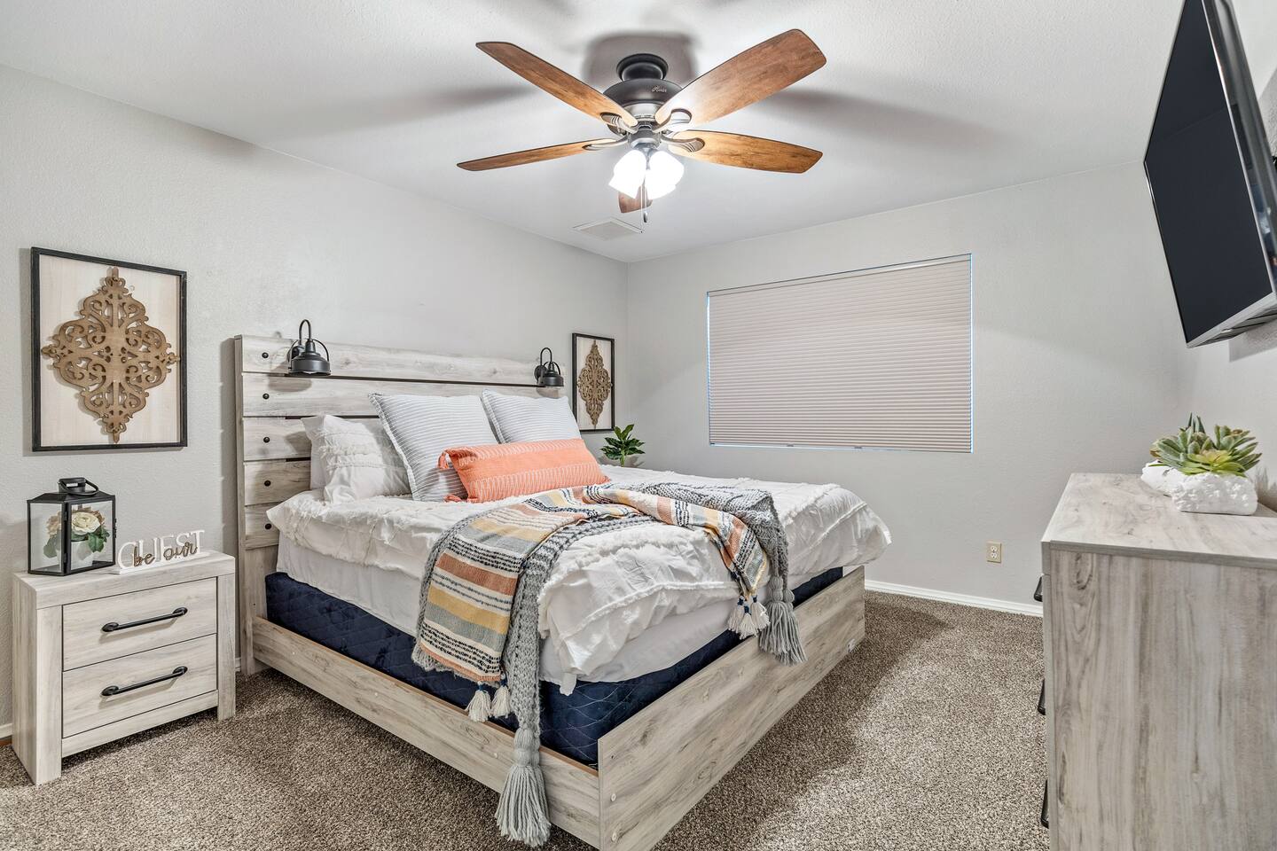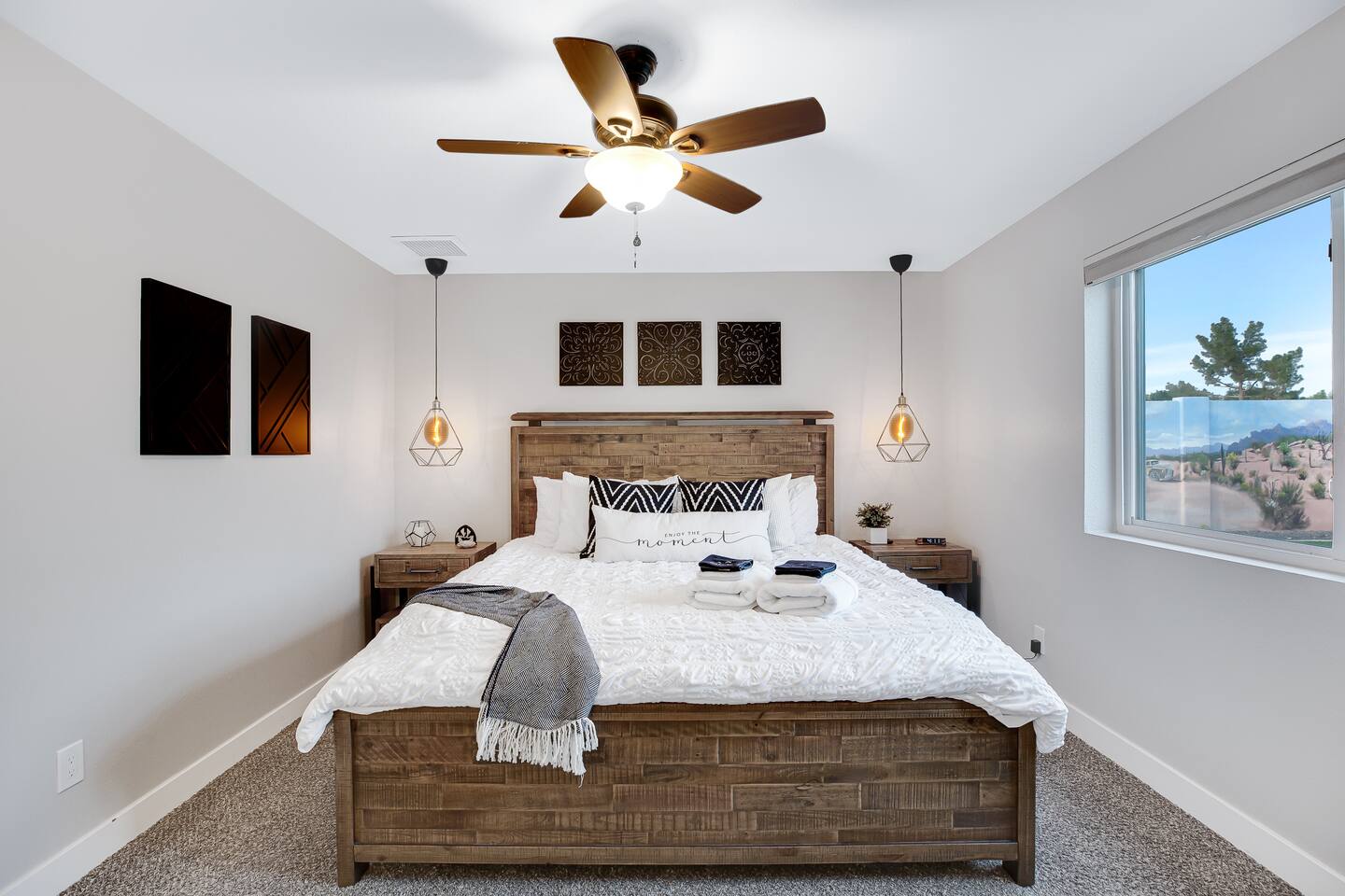 Arizona’s warm climate and scenic mountain views, allow for enjoyment of outdoor living year-round whether you are a Golfer, a sports enthusiast, avid hiker, or vacationer. With the ability to comfortably sleep up to 8 people, it is perfect for a group gathering, multi-family vacation, or single-family vacation. This rustic style home has both a romantic and relaxing atmosphere while also catering to families. Located conveniently off the I-10, Old Town Scottsdale is also only a 25-min drive away. The Backyard Oasis Grill and dine with friends and family under the large covered patio. Enjoy the fully stocked kitchen for all your meals. Take a dip in the sparkling pool, and soak in the sun at the poolside loungers while enjoying the scenic mountain views. The pool comes complete with a deep end and water basketball hoop in our beautifully landscaped yard. Pool season is year round at the Ranch with the pool heat set point to 85 degrees during fall, winter, and spring. Play a game of Cornhole on the grassy lawn or enjoy conversations while relaxing in the Adirondack chairs. Find shade under the large pergola while sharing drinks at the bar top. Let the outdoors be your indoors! ** Please note that the actual pool temperature can be lower than 85 degrees (low 80's/upper 70's) when we experience cooler weather (especially during winter months). This is an outdoor swimming pool and our heater is not designed to heat to hot tub temperatures. ** Please note that diving board pictured has been removed for liability purposes. Updated pictures coming soon** The Rooms The master suite has French doors that open to a poolside patio to share coffee or cocktails, and it offers a king bed and a private bathroom. There is a second oversized/large bedroom also fitted with a king bed. In the third bedroom, you will find a queen-sized bed while the fourth bedroom has two twin-sized beds. Up to two additional guests can sleep on the pull-out bed on the leather couch. Traveling with Children? We have thought of all the important details so you can travel lighter. We offer: a bedside bassinet for infants not yet sitting up, an infant and toddler bathtub, a pack-n-play for toddlers, a high chair, dishware for children, an infant carrier for hiking, and an umbrella stroller. The pool is also safely secured via proper gate.